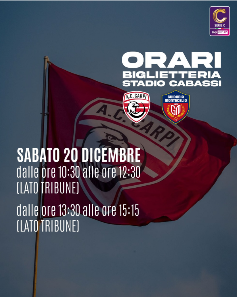 La società AC Carpi comunica che i biglietti per la sfida interna contro il Guidonia Montecelio, prevista per Sabato 20 Dicembre alle ore 14:30 e valida per la 19^ Giornata del Girone B di Serie C Sky Wifi, sono disponibili in prevendita sul circuito Vivaticket (clicca sulla scritta Vivaticket) al seguente link: https://www.vivaticket.com/it/ticket/serie-c-2025-2026-carpi-carpi-guidonia-montecelio/291705.