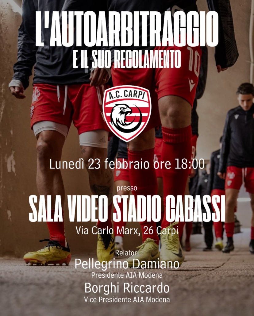 Si terrà Lunedì 23 Febbraio, alle ore 18.00, presso la Sala Video dello Stadio Cabassi (Via Carlo Marx n.26) l’incontro di approfondimento promosso dall’AC Carpi dal titolo “L’Autoarbitraggio e il suo regolamento”.