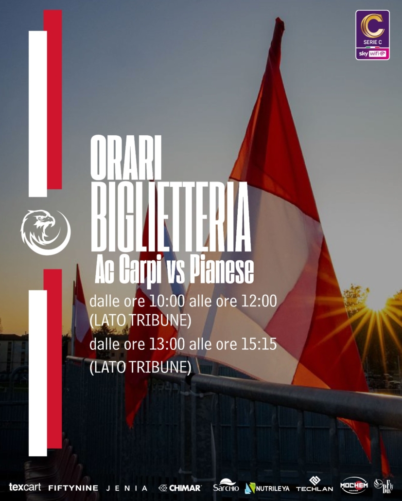La società AC Carpi comunica che i biglietti per la sfida interna contro la Pianese, prevista per Domenica 11 Gennaio alle ore 14:30 e valida per la 21^ Giornata del Girone B di Serie C Sky Wifi, sono disponibili in prevendita sul circuito Vivaticket (clicca sulla scritta Vivaticket) al seguente link: https://www.vivaticket.com/it/ticket/serie-c-2025-2026-carpi-carpi-pianese/293115.