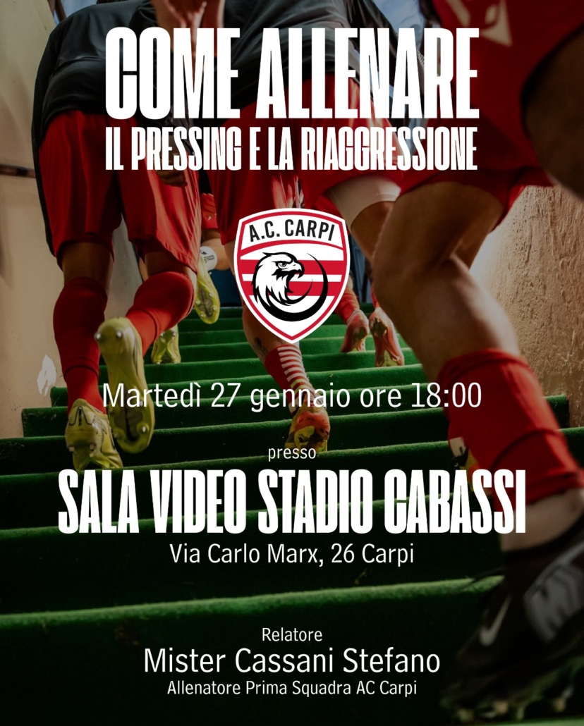 L’AC Carpi comunica che – Martedì 27 Gennaio dalle ore 18:00 – si terrà, presso la Sala Video dello Stadio “Cabassi” di Carpi (via Carlo Marx 26), l’incontro di approfondimento – promosso dall’AC Carpi – dal titolo “Come allenare il pressing e la riaggressione”.
