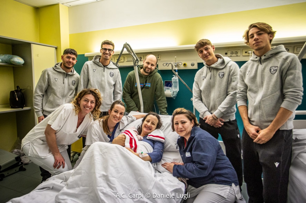 Proprio negli stessi istanti, all’Ospedale “Ramazzini – è nata Teresa, figlia di Maria e Gabriele. I neogenitori, venuti a conoscenza della contemporanea presenza dei calciatori biancorossi all’interno della struttura ospedaliera, hanno espresso il desiderio di poter incontrare la delegazione dell’AC Carpi e scattare una foto ricordo insieme.