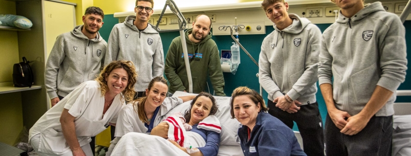 La richiesta è stata piacevolmente accolta: il Vice Presidente Andrea Lazzaretti, il Direttore Generale Enrico Bonzanini e i calciatori Matteo Sorzi, Matteo Rossini, Tommaso Cecotti e Riccardo Forte si sono recati presso il reparto di Neonatologia per salutare mamma, papà e la piccola Teresa, portando loro i propri auguri e condividendo con la famiglia un momento di vita indimenticabile.