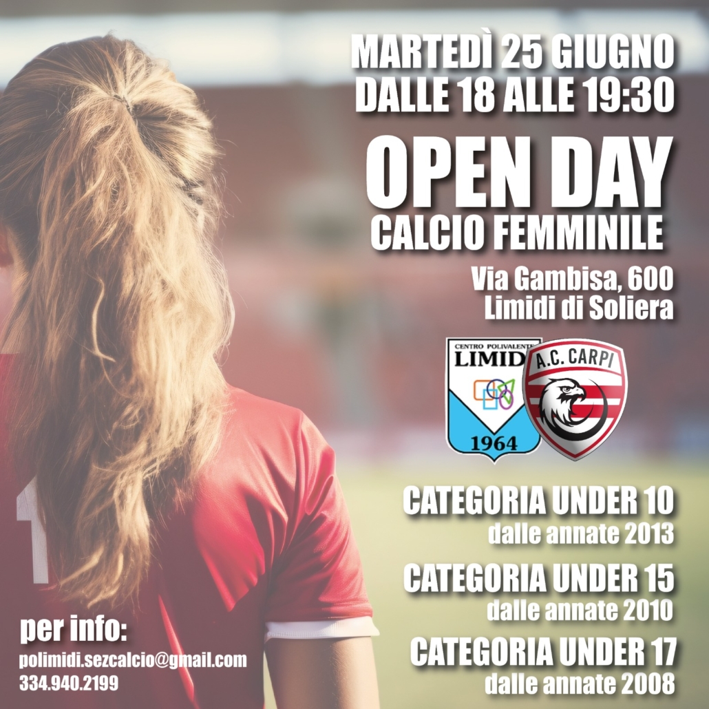 L’AC Carpi e il Centro Polivalente di Limidi organizzano un “OpenDay” dedicato al calcio femminile giovanile. L’appuntamento è per Martedì 25 Giugno, a partire dalle ore 18, presso il campo sportivo “Bruno Ghelfi” in Via Gambisa n°600 (Limidi di Soliera).