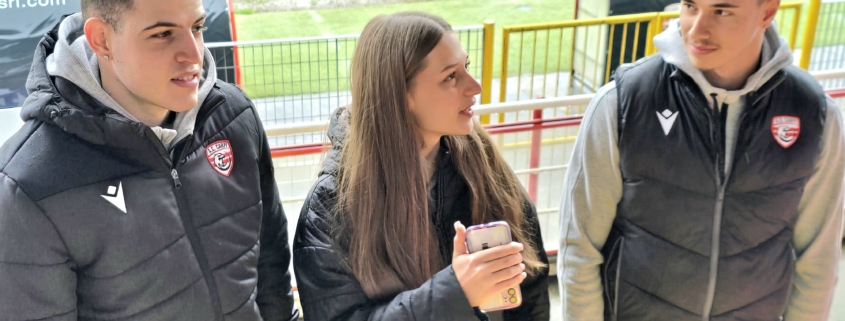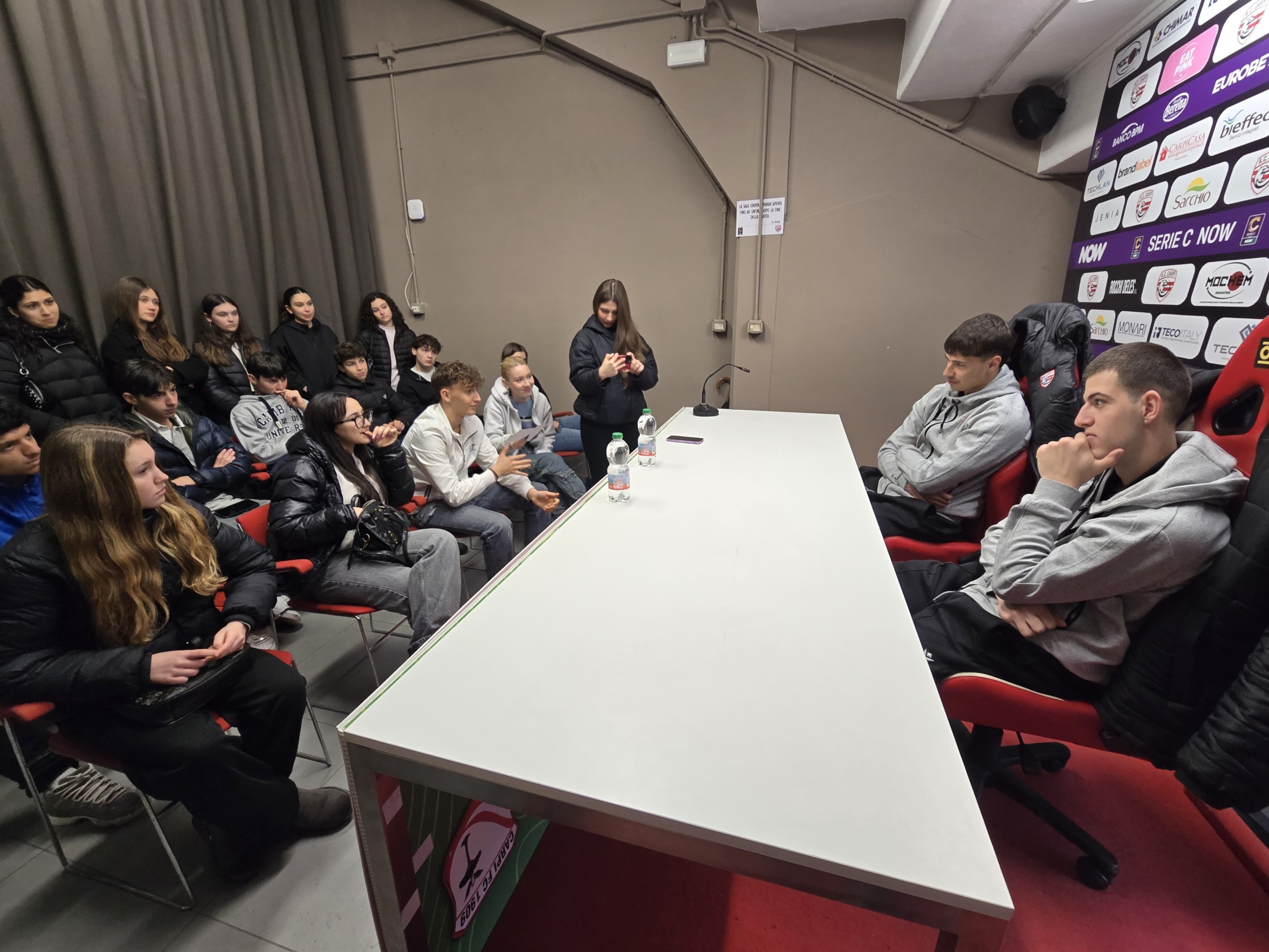 Questa mattina, nella sala stampa dello stadio – intitolata dal 2021 al decano dei giornalisti carpigiani Corrado Vellani – sono stati i ragazzi e le ragazze della classe 3P ad aver avuto l’opportunità di intervistare i centrocampisti biancorossi Nicolò Contiliano e Marco Forapani.