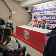 Nella mattinata di oggi, si è tenuta nella sala stampa dello Stadio “Cabassi” – dedicata dal 2021 al decano dei giornalisti carpigiani, Corrado Vellani – una conferenza stampa speciale: ad intervistare i calciatori della prima squadra, Rodrick Tcheuna e Daniel Theiner, sono stati i ragazzi della classe 3R del Liceo Fanti, divenuti veri e propri giornalisti per un giorno.